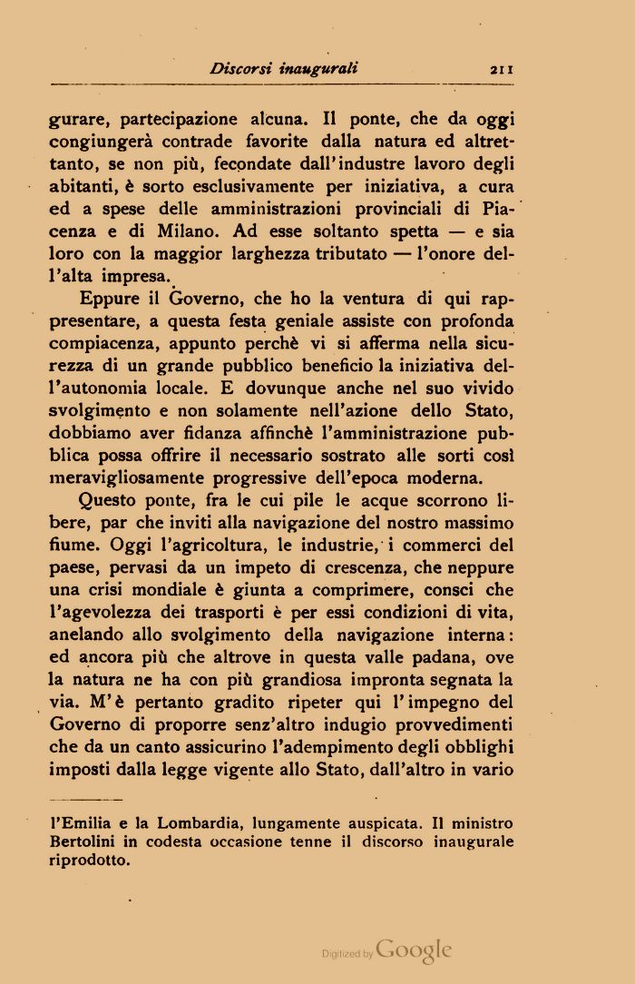 Questo ponte, fra le cui pile le acque scorrono libere, par che inviti alla navigazione del nostro massimo fiume. Oggi l'agricoltura, le industrie, i commerci del paese, pervasi da un impeto di crescenza, che neppure una crisi mondiale è giunta a comprimere, consci che l'agevolezza dei trasporti è per essi condizioni di vita, anelando allo svolgimento della navigazione interna : ed ancora più che altrove in questa valle padana, ove la natura ne ha con più grandiosa impronta segnata la via. M'è pertanto gradito ripeter qui l'impegno del Governo di proporre senz'altro indugio provvedimenti che da un canto assicurino l'adempimento degli obblighi imposti dalla legge vigente allo Stato, dall'altro in vario