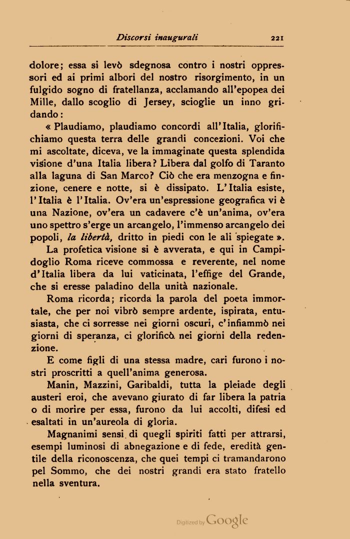 « Plaudiamo, plaudiamo concordi all'Italia, glorifichiamo questa terra delle grandi concezioni. Voi che mi ascoltate, diceva, ve la immaginate questa splendida visione d'una Italia libera? Libera dal golfo di Taranto alla laguna di San Marco? Ciò che era menzogna e finzione, cenere e notte, si è dissipato. L'Italia esiste, l'Italia è l'Italia. Ov'era un'espressione geografica vi è una Nazione, ov'era un cadavere c'è un'anima, ov'era uno spettro s'erge un arcangelo, l'immenso arcangelo dei popoli, la libertà, dritto in piedi con le ali spiegate ».