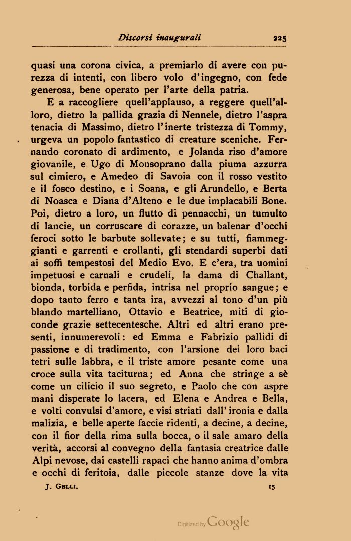 E a raccogliere quell'applauso, a reggere quell'alloro, dietro la pallida grazia di Nennele, dietro l'aspra tenacia di Massimo, dietro 1* inerte tristezza di Toramy, urgeva un popolo fantastico di creature sceniche. Fernando coronato di ardimento, e Jolanda riso d'amore giovanile, e Ugo di Monsoprano dalla piuma azzurra sul cimiero, e Amedeo di Savoia con il rosso vestito e il fosco destino, e i Soana, e gli Arundello, e Berta di Noasca e Diana d'Alteno e le due implacabili Bone. Poi, dietro a loro, un flutto di pennacchi, un tumulto di lande, un corruscare di corazze, un balenar d'occhi feroci sotto le barbute sollevate; e su tutti, fiammeggianti e garrenti e crollanti, gli stendardi superbi dati ai soffi tempestosi del Medio Evo. E c'era, tra uomini impetuosi e carnali e crudeli, la dama di Challant, bionda, torbida e perfida, intrisa nel proprio sangue; e dopo tanto ferro e tanta ira, avvezzi al tono d'un pił blando martelliano, Ottavio e Beatrice, miti di gioconde grazie settecentesche. Altri ed altri erano presenti, innumerevoli: ed Emma e Fabrizio pallidi di passione e di tradimento, con l'arsione dei loro baci tetri sulle labbra, e il triste amore pesante come una croce sulla vita taciturna; ed Anna che stringe a sč come un cilicio il suo segreto, e Paolo che con aspre mani disperate lo lacera, ed Elena e Andrea e Bella, e volti convulsi d'amore, e visi striati dall' ironia e dalla malizia, e belle aperte faccie ridenti, a decine, a decine, con il fior della rima sulla bocca, o il sale amaro della veritą, accorsi al convegno della fantasia creatrice dalle Alpi nevose, dai castelli rapaci che hanno anima d'ombra e occhi di feritoia, dalle piccole stanze dove la vita