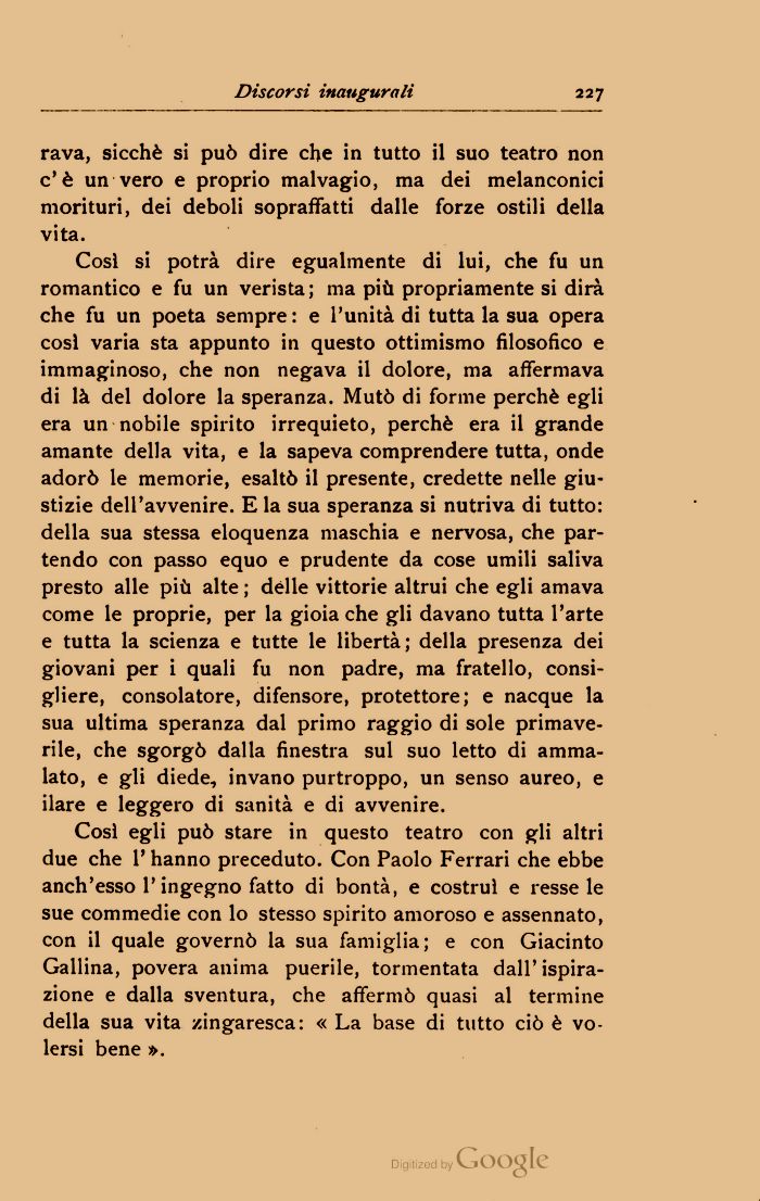 Così egli può stare in questo teatro con gli altri due che l'hanno preceduto. Con Paolo Ferrari che ebbe anch'esso l'ingegno fatto di bontà, e costruì e resse le sue commedie con lo stesso spirito amoroso e assennato, con il quale governò la sua famiglia; e con Giacinto Gallina, povera anima puerile, tormentata dall'ispirazione e dalla sventura, che affermò quasi al termine della sua vita zingaresca: « La base di tutto ciò è volersi bene ».