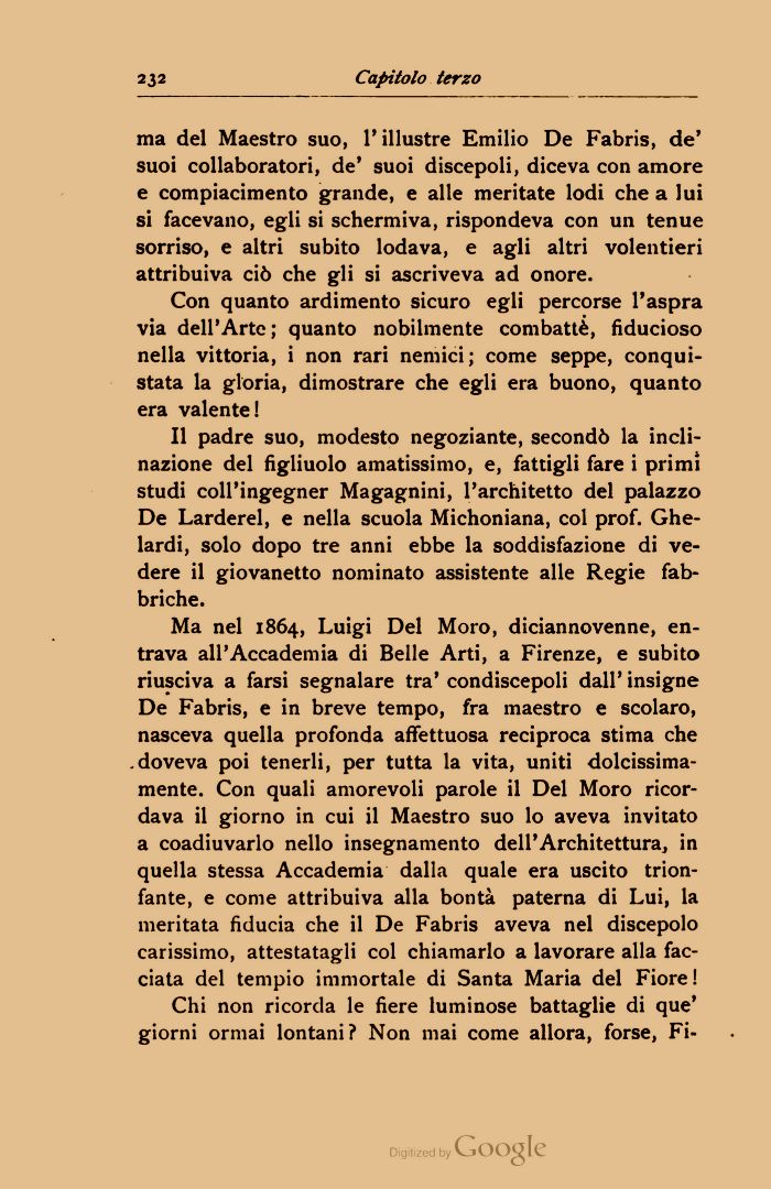 Ma nel 1864, Luigi Del Moro, diciannovenne, entrava all'Accademia di Belle Arti, a Firenze, e subito riusciva a farsi segnalare tra' condiscepoli dall' insigne De Fabris, e in breve tempo, fra maestro e scolaro, nasceva quella profonda affettuosa reciproca stima che .doveva poi tenerli, per tutta la vita, uniti dolcissimamente. Con quali amorevoli parole il Del Moro ricordava il giorno in cui il Maestro suo lo aveva invitato a coadiuvarlo nello insegnamento dell'Architettura, in quella stessa Accademia dalla quale era uscito trionfante, e come attribuiva alla bontà paterna di Lui, la meritata fiducia che il De Fabris aveva nel discepolo carissimo, attestatagli col chiamarlo a lavorare alla facciata del tempio immortale di Santa Maria del Fiore!