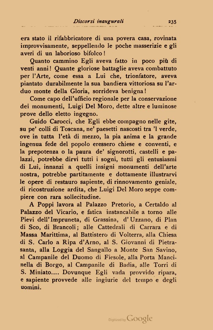 Guido Carocci, che Egli ebbe compagno nelle gite, su pe' colli di Toscana, ne' paesetti nascosti tra '1 verde, ove in tutta l'etą di mezzo, la pia anima e la grande ingenua fede del popolo eressero chiese e conventi, e la prepotenza o la paura de' signorotti, castelli e palazzi, potrebbe dirvi tutti i sogni, tutti gli entusiasmi di Lui, innanzi a quelli insigni monumenti dell'arte nostra, potrebbe paratamente e dottamente illustrarvi le opere di restauro sapiente, di rinnovamento geniale, di ricostruzione ardita, che Luigi Del Moro seppe compiere con rara sollecitudine.