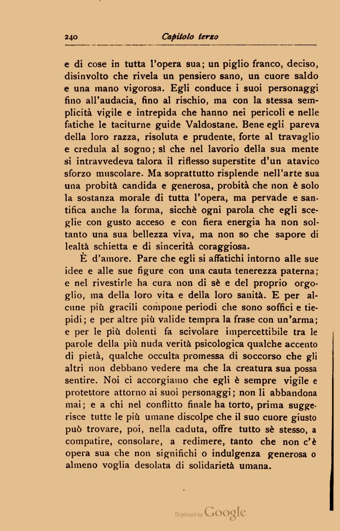 e di cose in tutta l'opera sua; un piglio franco, deciso, disinvolto che rivela un pensiero sano, un cuore saldo e una mano vigorosa. Egli conduce i suoi personaggi fino all'audacia, fino al rischio, ma con la stessa semplicità vigile e intrepida che hanno nei pericoli e nelle fatiche le taciturne guide Valdostane. Bene egli pareva della loro razza, risoluta e prudente, forte al travaglio e credula al sogno ; sì che nel lavorio della sua mente si intravvedeva talora il riflesso superstite d'un atavico sforzo muscolare. Ma soprattutto risplende nell'arte sua una probità candida e generosa, probità che non è solo la sostanza morale di tutta l'opera, ma pervade e santifica anche la forma, sicché ogni parola che egli sceglie con gusto acceso e con fiera energia ha non soltanto una sua bellezza viva, ma non so che sapore di lealtà schietta e di sincerità coraggiosa.