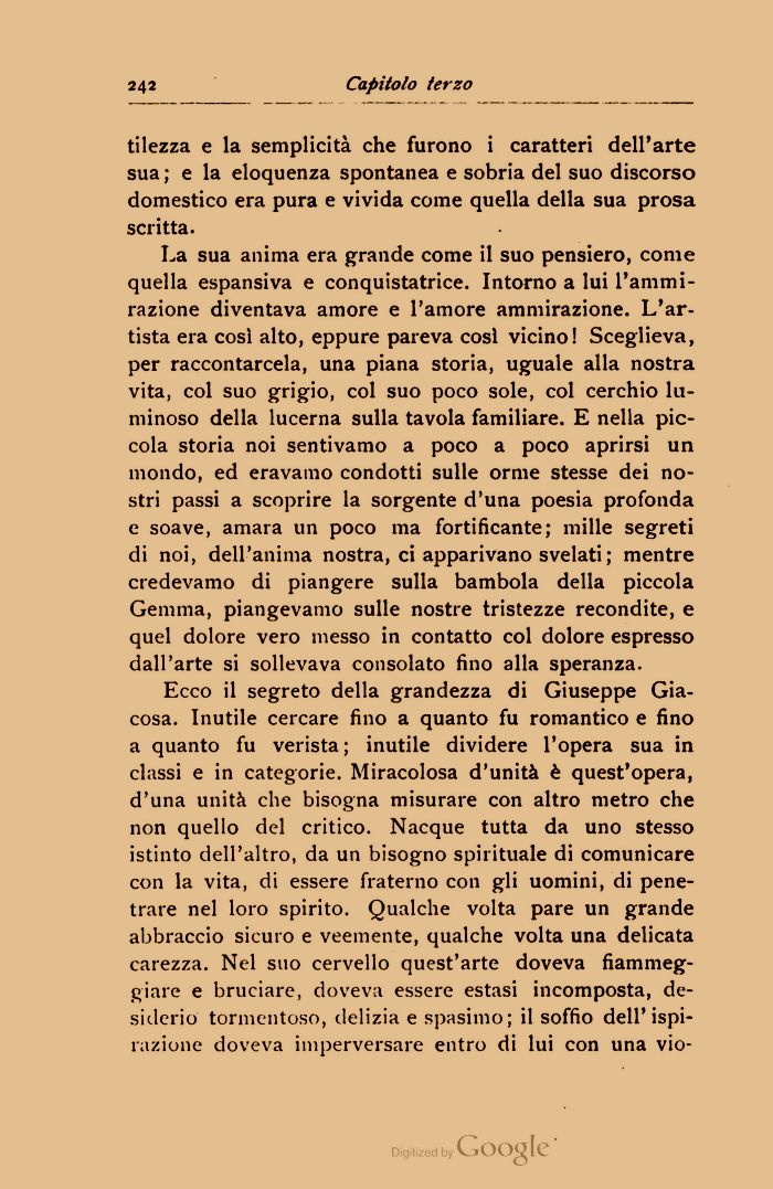 Ecco il segreto della grandezza di Giuseppe Gia-cosa. Inutile cercare fino a quanto fu romantico e fino a quanto fu verista ; inutile dividere l'opera sua in classi e in categorie. Miracolosa d'unità è quest'opera, d'una unità che bisogna misurare con altro metro che non quello del critico. Nacque tutta da uno stesso istinto dell'altro, da un bisogno spirituale di comunicare con la vita, di essere fraterno con gli uomini, di penetrare nel loro spirito. Qualche volta pare un grande abbraccio sicuro e veemente, qualche volta una delicata carezza. Nel suo cervello quest'arte doveva fiammeggiare e bruciare, doveva essere estasi incomposta, desiderio tormentoso, delizia e spasimo; il soffio dell'ispirazione doveva imperversare entro di lui con una vio-