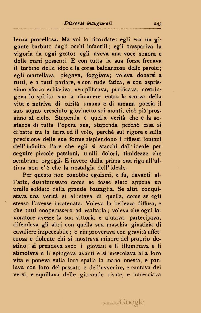 lenza procellosa. Ma voi lo ricordate: egli era un gigante barbuto dagli occhi infantili ; egli traspariva la vigoria da ogni gesto; egli aveva una voce sonora e delle mani possenti. E con tutta la sua forza frenava il turbine delle idee e la corsa baldanzosa delle parole; egli martellava, piegava, foggiava; voleva donarsi a tutti, e a tutti parlare, e con rude fatica, e con aspris-simo sforzo schiariva, semplificava, purificava, costringeva lo spirito suo a rimanere entro la scorza della vita e nutriva di carità umana e di umana poesia il suo sogno cresciuto giovinetto sui monti, cioè più prossimo al cielo. Stupenda è quella verità che è la sostanza di tutta l'opera sua, stupenda perchè essa si dibatte tra la terra ed il volo, perchè sul rigore e sulla precisione delle sue forme risplendono i riflessi lontani dell' infinito. Pare che egli si stacchi dall' ideale per seguire piccole passioni, umili dolori, timidezze che sembrano orgogli. E invece dalla prima sua riga all'ultima non c' è che la nostalgia dell' ideale.