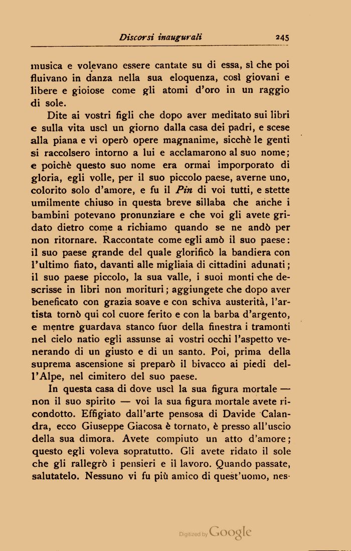 Dite ai vostri figli che dopo aver meditato sui libri e sulla vita usci un giorno dalla casa dei padri, e scese alla piana e vi operò opere magnanime, sicché le genti si raccolsero intorno a lui e acclamarono al suo nome ; e poiché questo suo nome era ormai imporporato di gloria, egli volle, per il suo piccolo paese, averne uno, colorito solo d'amore, e fu il Pin di voi tutti, e stette umilmente chiuso in questa breve sillaba che anche i bambini potevano pronunziare e che voi gli avete gridato dietro come a richiamo quando se ne andò per non ritornare. Raccontate come egli amò il suo paese : il suo paese grande del quale glorificò la bandiera con l'ultimo fiato, davanti alle migliaia di cittadini adunati; il suo paese piccolo, la sua valle, i suoi monti -che descrisse in libri non morituri ; aggiungete che dopo aver beneficato con grazia soave e con schiva austerità, l'artista tornò qui col cuore ferito e con la barba d'argento, e mentre guardava stanco fuor della finestra i tramonti nel cielo natio egli assunse ai vostri occhi l'aspetto venerando di un giusto e di un santo. Poi, prima della suprema ascensione si preparò il bivacco ai piedi dell'Alpe, nel cimitero del suo paese.