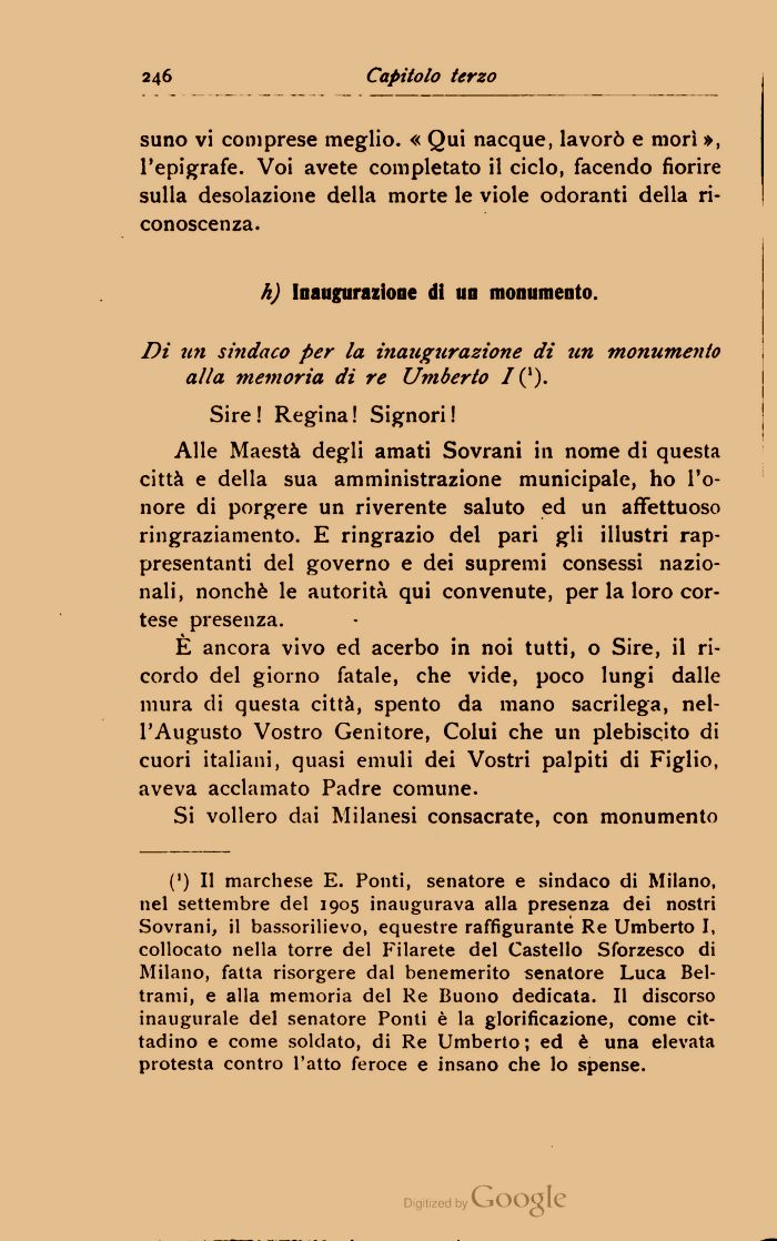 (') Il marchese E. Ponti, senatore e sindaco di Milano, nel settembre del 1905 inaugurava alla presenza dei nostri Sovrani, il bassorilievo, equestre raffigurante Re Umberto I, collocato nella torre del Filarete del Castello Sforzesco di Milano, fatta risorgere dal benemerito senatore Luca Bel-trami, e alla memoria del Re Buono dedicata. Il discorso inaugurale del senatore Ponti è la glorificazione, come cittadino e come soldato, di Re Umberto; ed è una elevata protesta contro l'atto feroce e insano che lo spense.