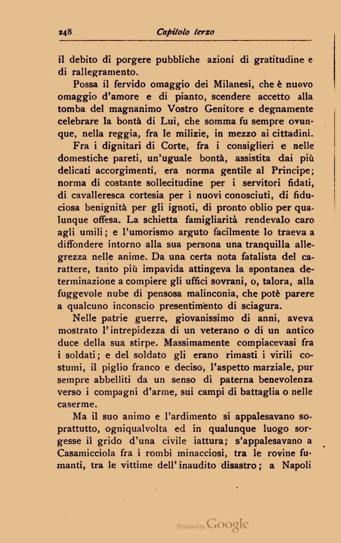 Fra i dignitari di Corte, fra i consiglieri e nelle domestiche pareti, un'uguale bontà, assistita dai più delicati accorgimenti, era norma gentile al Principe; norma di costante sollecitudine per i servitori fidati, di cavalleresca cortesia per i nuovi conosciuti, di fiduciosa benignità per gli ignoti, di pronto oblio per qualunque offesa. La schietta famigliarità rendevalo caro agli umili ; e l'umorismo arguto facilmente lo traeva a diffondere intorno alla sua persona una tranquilla allegrezza nelle anime. Da una certa nota fatalista del carattere, tanto più impavida attingeva la spontanea determinazione a compiere gli uffici sovrani, o, talora, alla fuggevole nube di pensosa malinconia, che potè parere a qualcuno inconscio presentimento di sciagura.