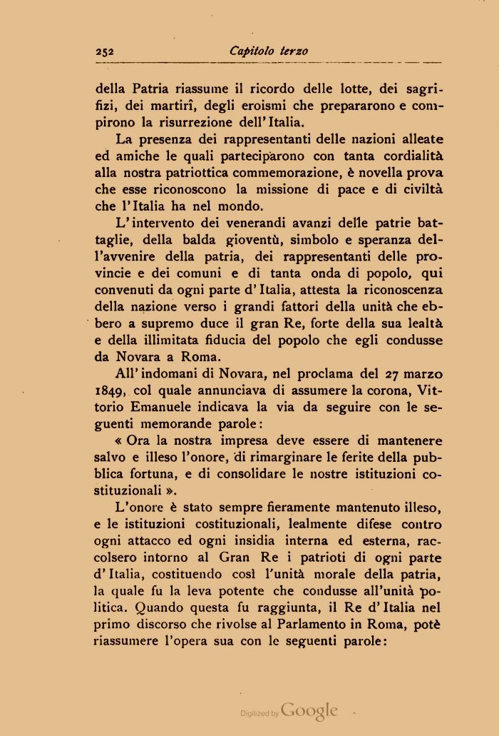 L'onore è stato sempre fieramente mantenuto illeso, e le istituzioni costituzionali, lealmente difese contro ogni attacco ed ogni insidia interna ed esterna, raccolsero intorno al Gran Re i patrioti di ogni parte d'Italia, costituendo così l'unità morale della patria, la quale fu la leva potente che condusse all'unità politica. Quando questa fu raggiunta, il Re d'Italia nel primo discorso che rivolse al Parlamento in Roma, potè riassumere l'opera sua con le seguenti parole:
