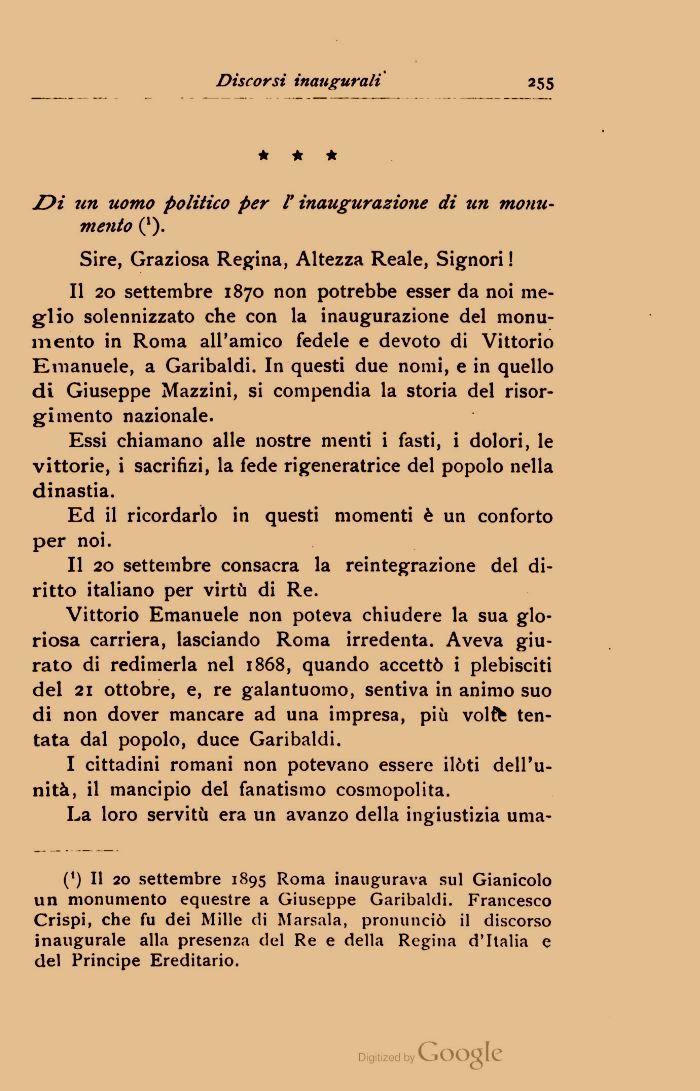 Il 20 settembre 1870 non potrebbe esser da noi meglio solennizzato che con la inaugurazione del monumento in Roma all'amico fedele e devoto di Vittorio Emanuele, a Garibaldi. In questi due nomi, e in quello di Giuseppe Mazzini, si compendia la storia del risorgimento nazionale.
