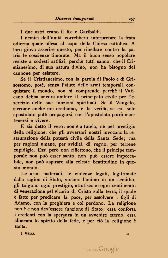 Le armi materiali, le violenze legali, legittimate dalla ragion di Stato, violano l'animo di un semidio, gli tolgono ogni prestigio, attutiscono ogni sentimento di venerazione pel vicario di Cristo sulla terra, il quale è fatto per predicare la pace, per assolvere i figli dì Adamo, con la preghiera e col perdono. La religione non è e non dev'essere funzione di Stato; essa conforta i credenti con la speranza in un avvenire eterno, essa alimenta lo spirito della fede, e per ciò la religione è santa.