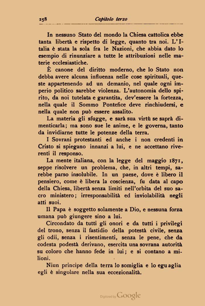 La mente italiana, con la legge del maggio 1871, seppe risolvere un problema, che, in altri tempi, sarebbe parso insolubile. In un paese, dove è libero il pensiero, come è libera la coscienza, fu data al capo della Chiesa, libertà senza limiti nell'orbita del suo sacro ministero ; irresponsabilità ed inviolabilità negli atti suoi.