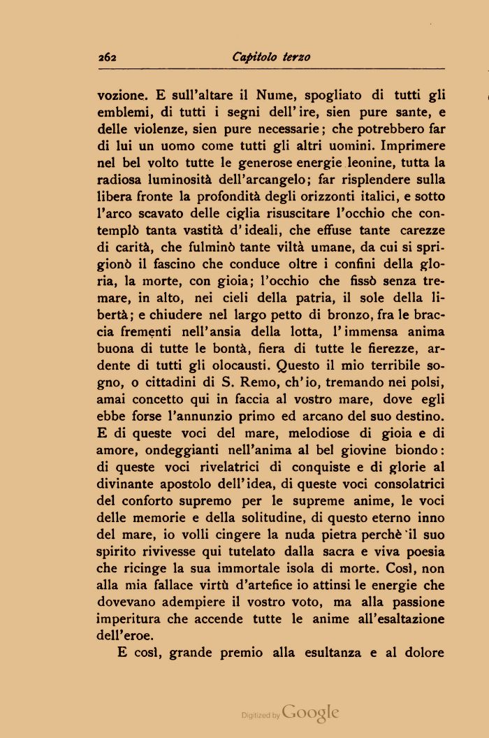 vozione. E sull'altare il Nume, spogliato di tutti gli emblemi, di tutti i segni dell'ire, sien pure sante, e delle violenze, sien pure necessarie ; che potrebbero far di lui un uomo come tutti gli altri uomini. Imprimere nel bel volto tutte le generose energie leonine, tutta la radiosa luminosità dell'arcangelo; far risplendere sulla libera fronte la profondità degli orizzonti italici, e sotto l'arco scavato delle ciglia risuscitare l'occhio che contemplò tanta vastità d'ideali, che effuse tante carezze di carità, che fulminò tante viltà umane, da cui si sprigionò il fascino che conduce oltre i confini della gloria, la morte, con gioia; l'occhio che fissò senza tremare, in alto, nei cieli della patria, il sole della libertà; e chiudere nel largo petto di bronzo, fra le braccia frementi nell'ansia della lotta, l'immensa anima buona di tutte le bontà, fiera di tutte le fierezze, ardente di tutti gli olocausti. Questo il mio terribile sogno, o cittadini di S. Remo, ch'io, tremando nei polsi, amai concetto qui in faccia al vostro mare, dove egli ebbe forse l'annunzio primo ed arcano del suo destino. E di queste voci del mare, melodiose di gioia e di amore, ondeggianti nell'anima al bel giovine biondo : di queste voci rivelatrici di conquiste e di glorie al divinante apostolo dell'idea, di queste voci consolatrici del conforto supremo per le supreme anime, le voci delle memorie e della solitudine, di questo eterno inno del mare, io volli cingere la nuda pietra perchè il suo spirito rivivesse qui tutelato dalla sacra e viva poesia che ricinge la sua immortale isola di morte. Cosi, non alla mia fallace virtù d'artefice io attinsi le energie che dovevano adempiere il vostro voto, ma alla passione imperitura che accende tutte le anime all'esaltazione dell'eroe.
