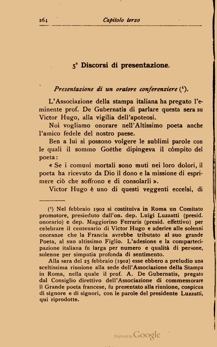 Alla sera del 25 febbraio (1902) esse ebbero a preludio una sceltissima riunione alla sede dell'Associazione della Stampa in Roma, nella quale il prof. A. De Gubernatis, pregato dal Consiglio direttivo dell'Associazione di commemorare il Grande poeta francese, fu presentato alla riunione, cospicua di signore e di signori, con le parole del presidente Luzzatti, qui riprodotte.
