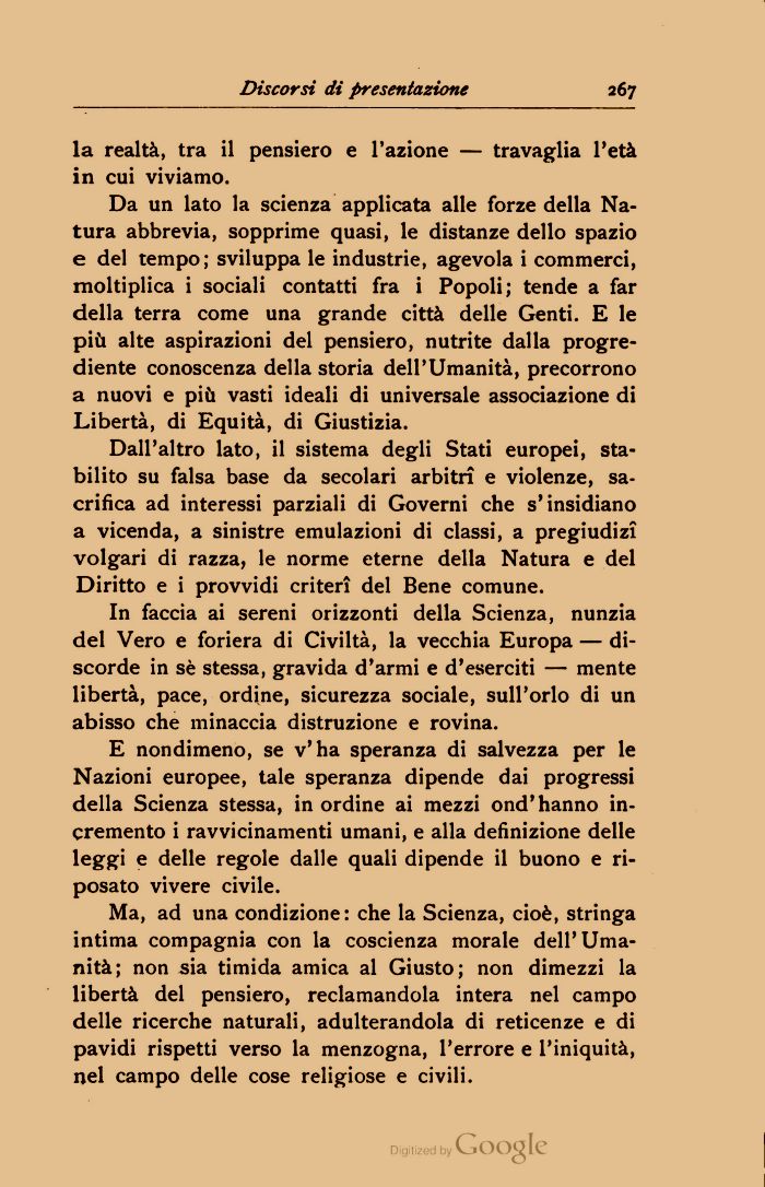 Da un lato la scienza applicata alle forze della Natura abbrevia, sopprime quasi, le distanze dello spazio e del tempo; sviluppa le industrie, agevola i commerci, moltiplica i sociali contatti fra i Popoli; tende a far della terra come una grande città delle Genti. E le più alte aspirazioni del pensiero, nutrite dalla progrediente conoscenza della storia dell'Umanità, precorrono a nuovi e più vasti ideali di universale associazione di Libertà, di Equità, di Giustizia.