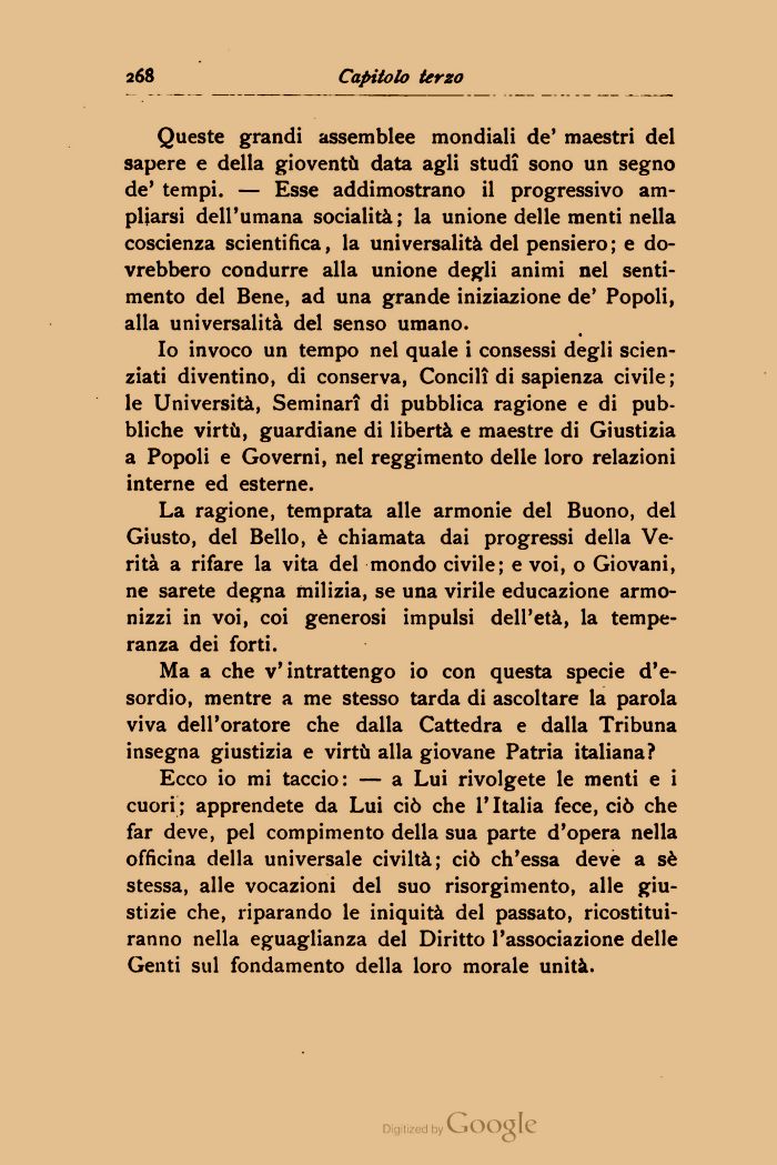 La ragione, temprata alle armonie del Buono, del Giusto, del Bello, è chiamata dai progressi della Verità a rifare la vita del mondo civile; e voi, o Giovani, ne sarete degna milizia, se una virile educazione armonizzi in voi, coi generosi impulsi dell'età, la temperanza dei forti.
