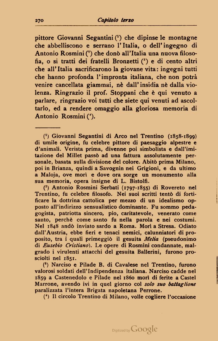 pittore Giovanni Segantini (') che dipinse le montagne che abbelliscono e serrano 1* Italia, o dell' ingegno di Antonio Rosmini (:) che donò all'Italia una nuova filosofia, o si tratti dei fratelli Bronzetti (3) e di cento altri che all'Italia sacrificarono la giovane vita: ingegni tutti che hanno profonda l'impronta italiana, che non potrà venire cancellata giammai, nè dall'insidia nè dalla violenza. Ringrazio il prof. Stoppani che è qui venuto a parlare, ringrazio voi tutti che siete qui venuti ad ascoltarlo, ed a rendere omaggio alla gloriosa memoria di Antonio Rosmini (').
