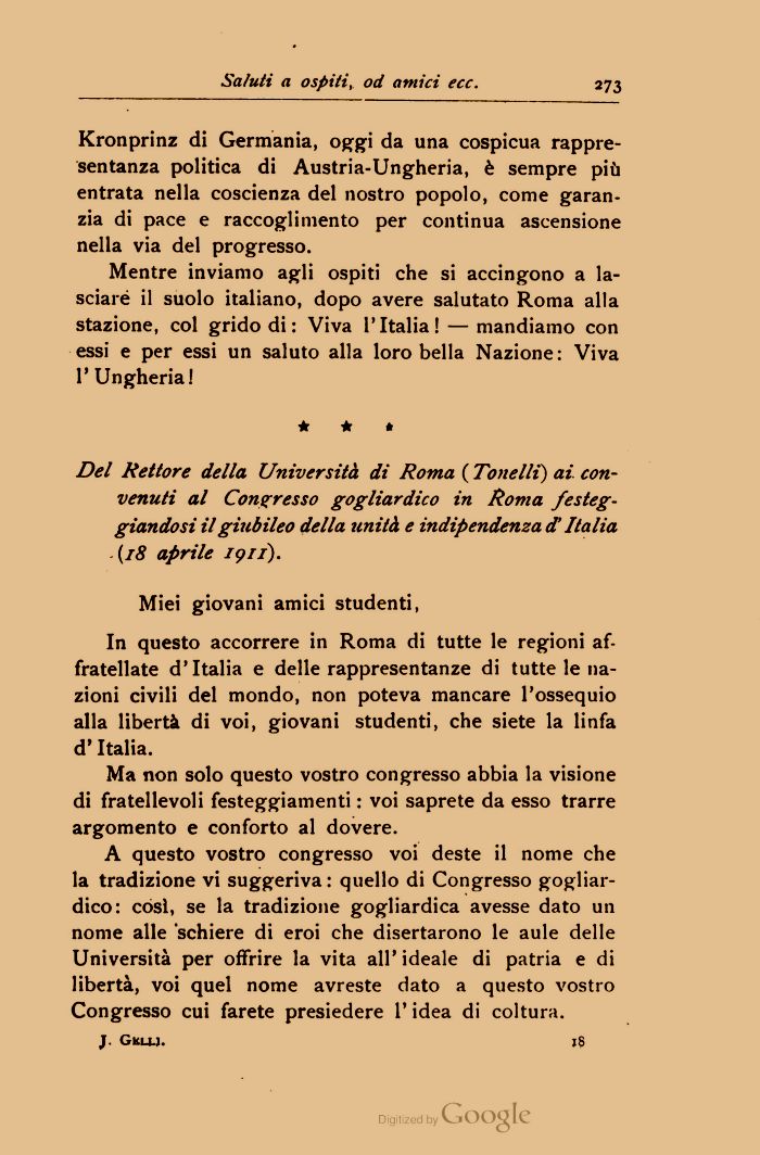 Del Rettore della Università di Roma ( Tonelli) ai convenuti al Congresso gogliardico in Roma festeggiandosi il giubileo della unità e indipendenza d'Italia (18 aprile 1911).