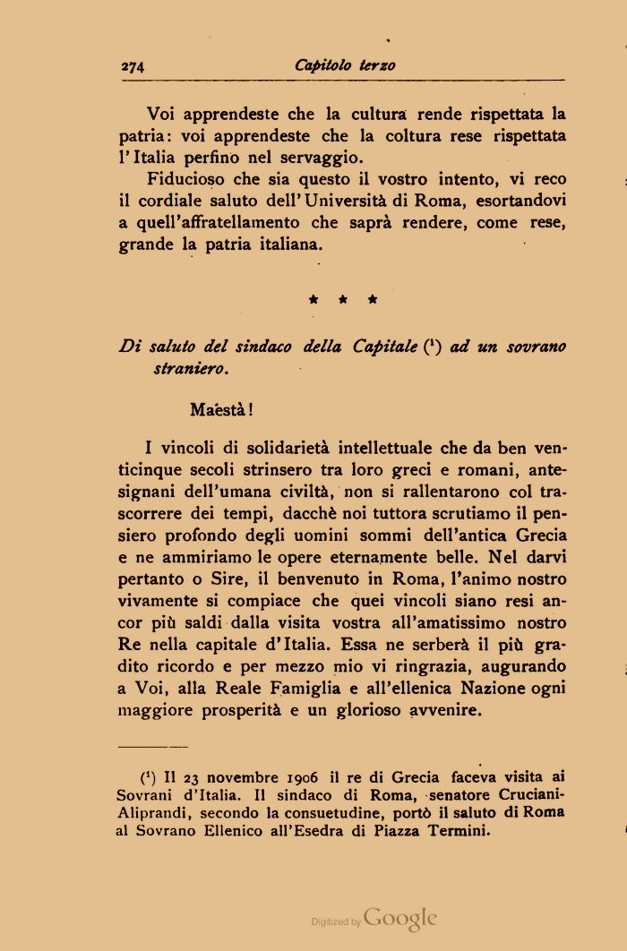 (') Il 23 novembre 1906 il re di Grecia faceva visita ai Sovrani d'Italia. Il sindaco di Roma, senatore Cruciani-Aliprandi, secondo la consuetudine, portò il saluto di Roma al Sovrano Ellenico all'Esedra di Piazza Termini.