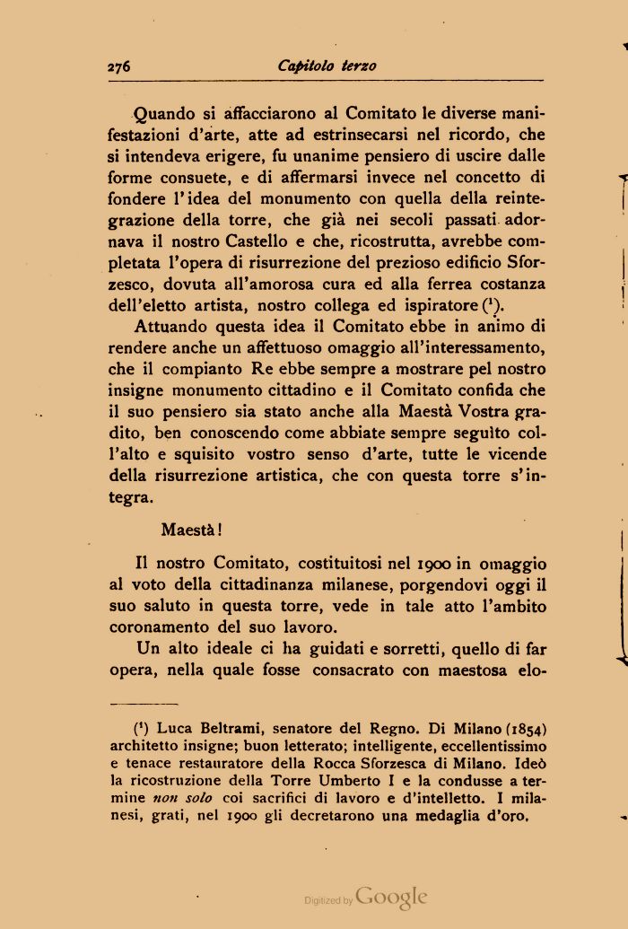 Attuando questa idea il Comitato ebbe in animo di rendere anche un affettuoso omaggio all'interessamento, che il compianto Re ebbe sempre a mostrare pel nostro insigne monumento cittadino e il Comitato confida che il suo pensiero sia stato anche alla Maestā Vostra gradito, ben conoscendo come abbiate sempre seguito col-l'alto e squisito vostro senso d'arte, tutte le vicende della risurrezione artistica, che con questa torre s'integra.