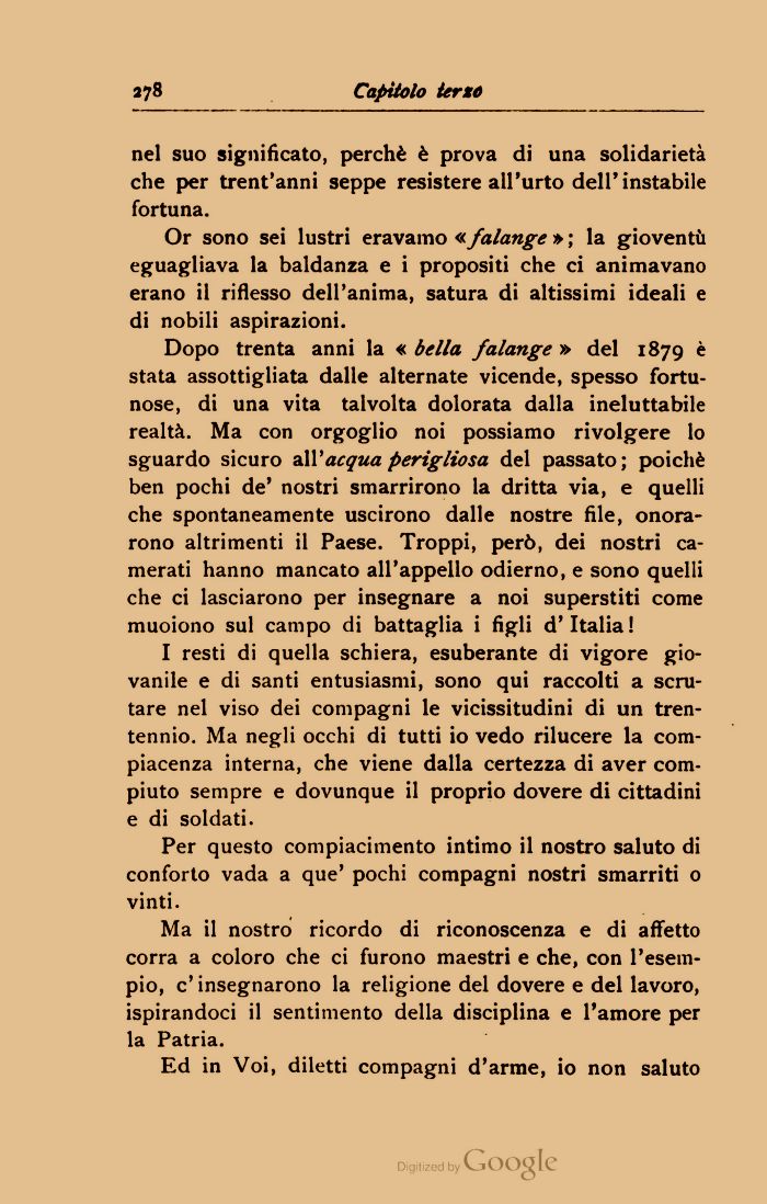 Dopo trenta anni la « bella falange » del 1879 è stata assottigliata dalle alternate vicende, spesso fortunose, di una vita talvolta dolorata dalla ineluttabile realtà. Ma con orgoglio noi possiamo rivolgere lo sguardo sicuro all'acqua perigliosa del passato; poiché ben pochi de' nostri smarrirono la dritta via, e quelli che spontaneamente uscirono dalle nostre file, onorarono altrimenti il Paese. Troppi, però, dei nostri camerati hanno mancato all'appello odierno, e sono quelli che ci lasciarono per insegnare a noi superstiti come muoiono sul campo di battaglia i figli d'Italia!