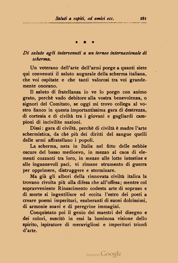 Un veterano dell'arte dell'armi porge a quanti siete qui convenuti il saluto augurale della scherma italiana, che voi ospitate e che tanti valorosi tra voi grandemente onorano.