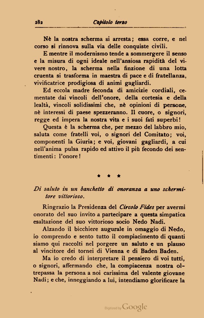 Questa č la scherma che, per mezzo del labbro mio, saluta come fratelli voi, o signori del Comitato; voi, componenti la Giuria; e voi, giovani gagliardi, a cui nell'anima pulsa rapido ed attivo il pių fecondo dei sentimenti : l'onore !