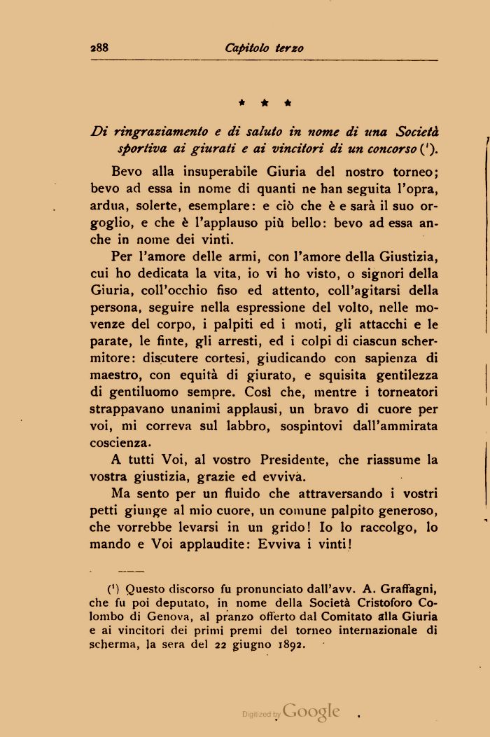 (') Questo discorso fu pronunciato dall'avv. A. Graffagni, che fu poi deputato, in nome della Società Cristoforo Colombo di Genova, al pranzo offerto dal Comitato alla Giuria e ai vincitori dei primi premi del torneo internazionale di scherma, la sera del 22 giugno 1892.