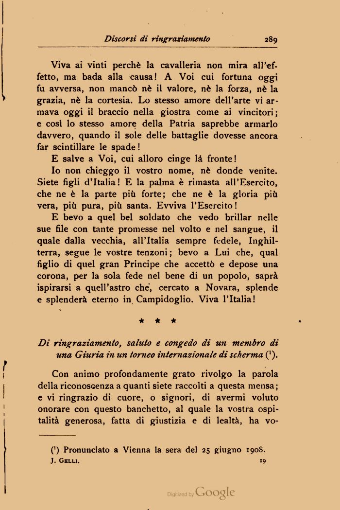Viva ai vinti perchè la cavalleria non mira all'effetto, ma bada alla causa! A Voi cui fortuna oggi fu avversa, non mancò nè il valore, nè la forza, nè la grazia, nè la cortesia. Lo stesso amore dell'arte vi armava oggi il braccio nella giostra come ai vincitori ; e cosi lo stesso amore della Patria saprebbe armarlo davvero, quando il sole delle battaglie dovesse ancora far scintillare le spade !