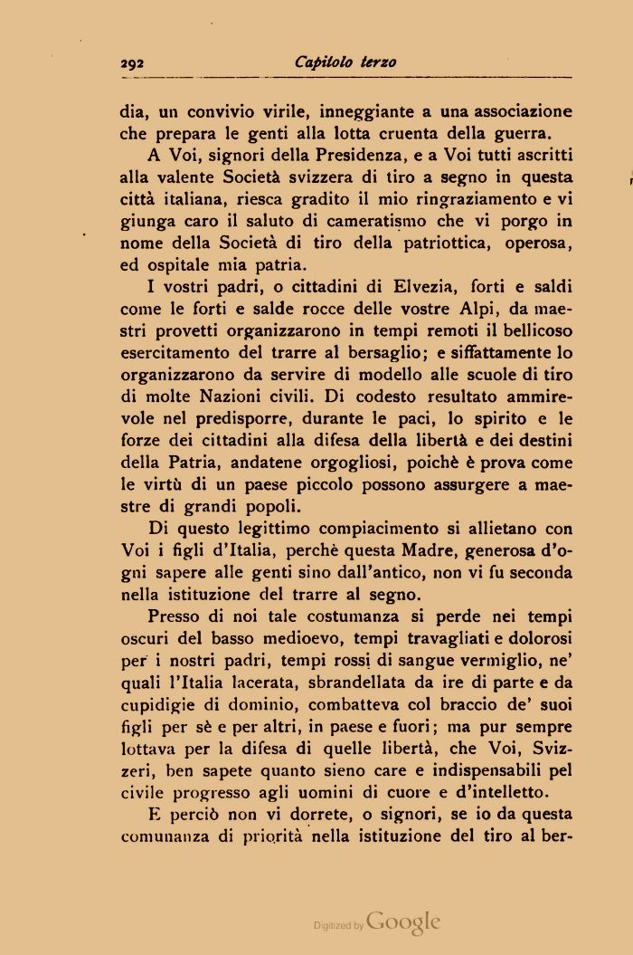A Voi, signori della Presidenza, e a Voi tutti ascritti alla valente Società svizzera di tiro a segno in questa città italiana, riesca gradito il mio ringraziamento e vi giunga caro il saluto di cameratismo che vi porgo in nome della Società di tiro della patriottica, operosa, ed ospitale mia patria.