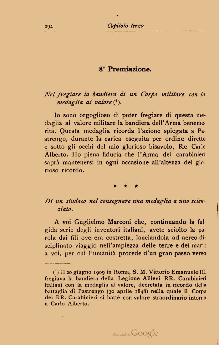 A voi Guglielmo Marconi che, continuando la fulgida serie degli inventori italiani, avete sciolto la parola dai fili ove era costretta, lanciandola ad aereo disciplinato viaggio nell'ampiezza delle terre e dei mari: a voi, per cui l'umanitą procede d'un gran passo verso