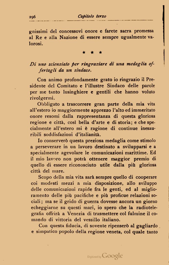 Scopo della mia vita sarà sempre quello di cooperare coi modesti mezzi a mia disposizione, allo sviluppo delle comunicazioni rapide fra le genti, ed al miglioramento delle più pacifiche e più proficue relazioni sociali ; ma se il grido di guerra dovesse ancora un giorno echeggiarne su questi mari, io spero che la radiotelegrafia offrirà a Venezia di trasmettere col fulmine il comando di vittoria del vessillo italiano.