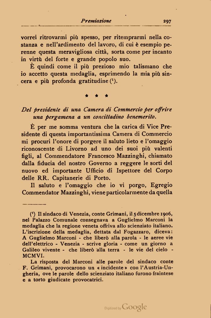 (1) Il sindaco di Venezia, conte Grimani, il 5dicembre 1906, nel Palazzo Comunale consegnava a Guglielmo Marconi la medaglia che la regione veneta offriva allo scienziato italiano. L'iscrizione della medaglia, dettata dal Fogazzaro, diceva: A Guglielmo Marconi - che liberò alla parola - le aeree vie dell'elettrico - Venezia - scrive gloria - come un giorno a Galileo vivente - che liberò alla terra - le vie del cielo -MCMVI.