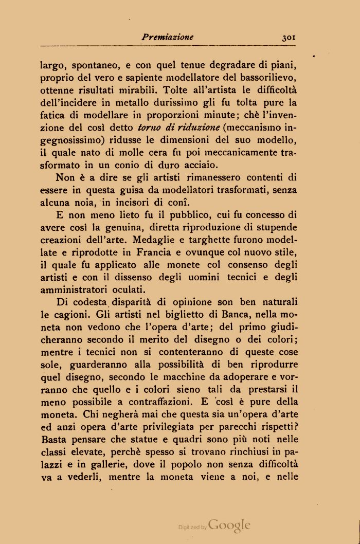 largo, spontaneo, e con quel tenue degradare di piani, proprio del vero e sapiente modellatore del bassorilievo, ottenne risultati mirabili. Tolte all'artista le difficoltà dell'incidere in metallo durissimo gli fu tolta pure la fatica di modellare in proporzioni minute; chè l'invenzione del cosi detto torno di riduzione (meccanismo ingegnosissimo) ridusse le dimensioni del suo modello, il quale nato di molle cera fu poi meccanicamente trasformato in un conio di duro acciaio.