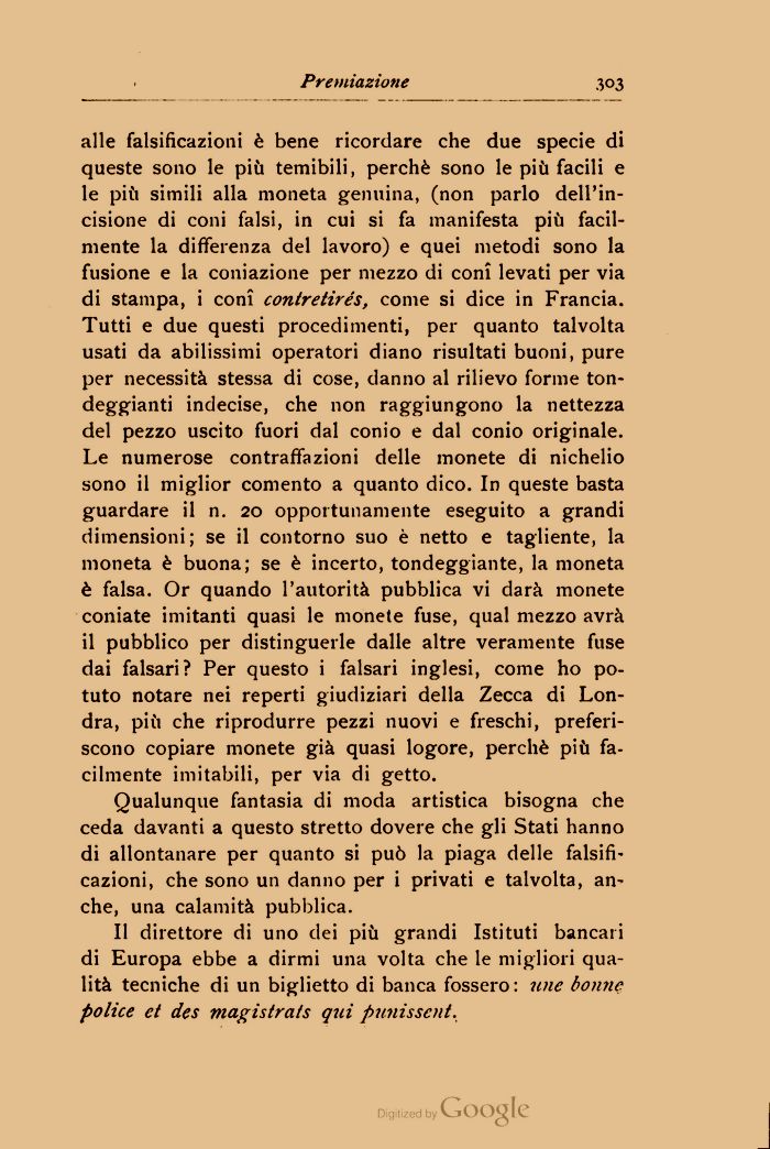 Qualunque fantasia di moda artistica bisogna che ceda davanti a questo stretto dovere che gli Stati hanno di allontanare per quanto si può la piaga delle falsificazioni, che sono un danno per i privati e talvolta, anche, una calamità pubblica.