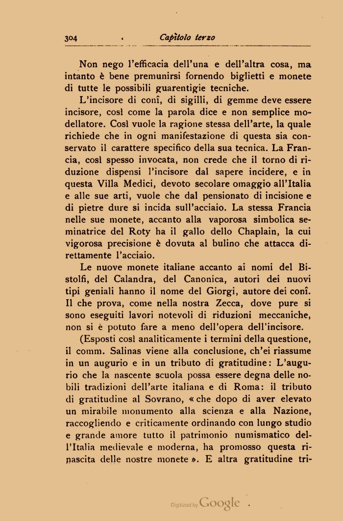 (Esposti cosě analiticamente i termini della questione, il corani. Salinas viene alla conclusione, ch'ei riassume in un augurio e in un tributo di gratitudine: L'augurio che la nascente scuola possa essere degna delle nobili tradizioni dell'arte italiana e di Roma: il tributo di gratitudine al Sovrano, «che dopo di aver elevato un mirabile monumento alla scienza e alla Nazione, raccogliendo e criticamente ordinando con lungo studio e grande amore tutto il patrimonio numismatico dell'Italia medievale e moderna, ha promosso questa rinascita delle nostre monete ». E altra gratitudine tri-