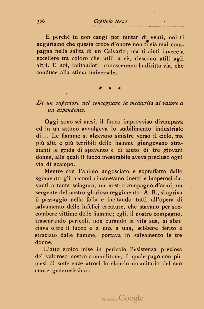 Mentre con l'animo angosciato e sopraffatto dallo sgomento gli accorsi rimanevano inerti e inoperosi davanti a tanta sciagura, un nostro compagno d'armi, un sergente del nostro glorioso reggimento: A. B., si apriva il passaggio nella folla e incitando tutti all'opera di salvamento delle infelici creature, che stavano per soccombere vittime delle fiamme; egli, il nostro compagno, trascurando pericoli, non curando la vita sua, si slanciava oltre il fuoco e a una a una, sebbene ferito e straziato dalle fiamme, portava in salvamento le tre donne.