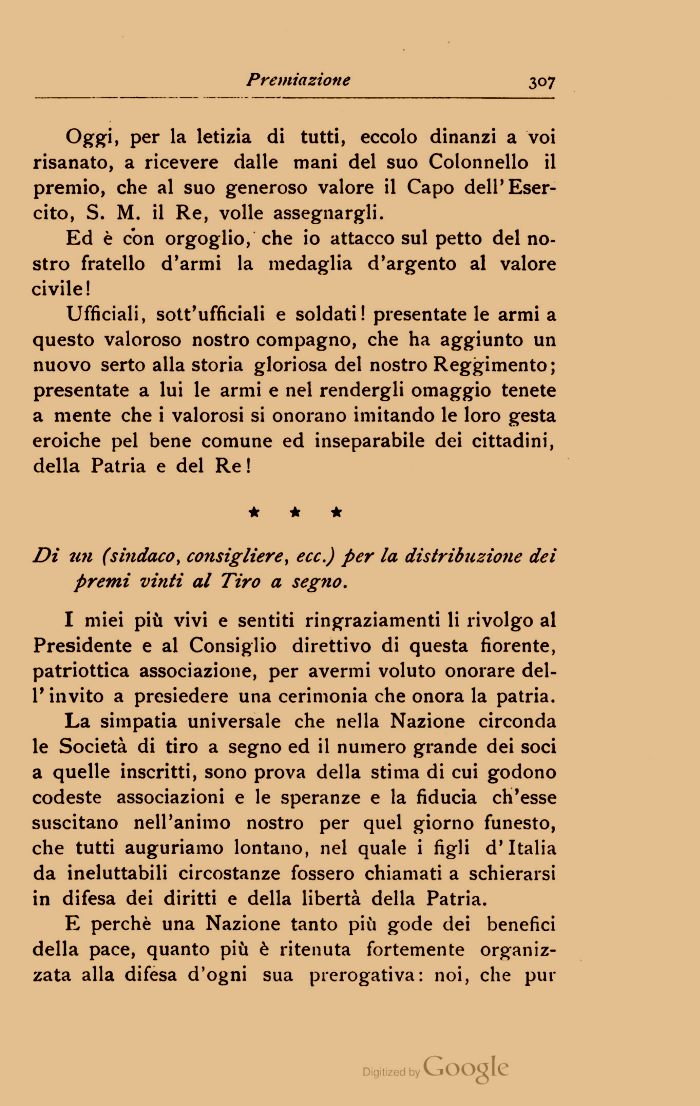 Oggi, per la letizia di tutti, eccolo dinanzi a voi risanato, a ricevere dalle mani del suo Colonnello il premio, che al suo generoso valore il Capo dell'Esercito, S. M. il Re, volle assegnargli.