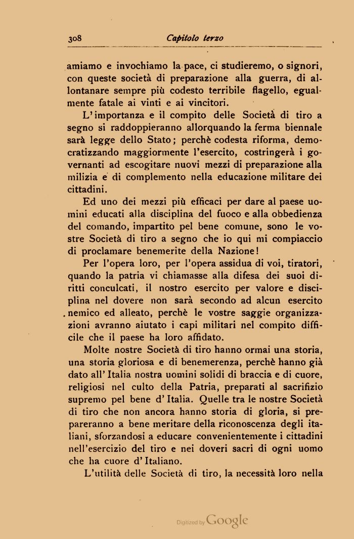 Per l'opera loro, per l'opera assidua di voi, tiratori, quando la patria vi chiamasse alla difesa dei suoi diritti conculcati, il nostro esercito per valore e disciplina nel dovere non sarà secondo ad alcun esercito nemico ed alleato, perchè le vostre saggie organizzazioni avranno aiutato i capi militari nel compito difficile che il paese ha loro affidato.