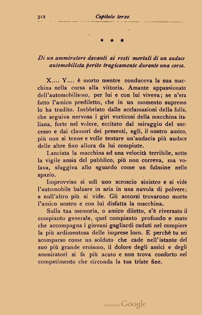 X.... Y.... è morto mentre conduceva la sua macchina nella corsa alla vittoria. Amante appassionato dell'automobilismo, per lui e con lui viveva; se n'era fatto l'amico prediletto, che in un momento supremo lo ha tradito. Inebbriato dalle acclamazioni della folla, che seguiva nervosa i giri vorticosi della macchina italiana, forte nel volere, eccitato dal miraggio del successo e dai clamori dei presenti, egli, il nostro amico, più non si tenne e volle tentare un'audacia più audace delle altre fino allora da lui compiute.