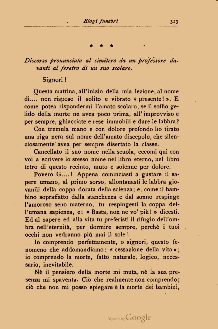 Discorso pronunciato al cimitero da un professore davanti al feretro di un suo scolaro.