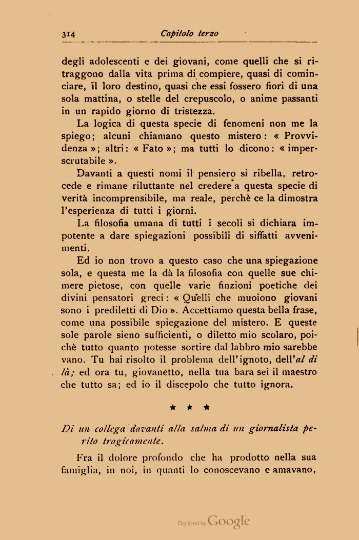 Ed io non trovo a questo caso che una spiegazione sola, e questa me la dà la filosofia con quelle sue chimere pietose, con quelle varie finzioni poetiche dei divini pensatori greci : « Quelli che muoiono giovani sono i prediletti di Dio ». Accettiamo questa bella frase, come una possibile spiegazione del mistero. E queste sole parole sieno sufficienti, o diletto mio scolaro, poiché tutto quanto potesse sortire dal labbro mio sarebbe vano. Tu hai risolto il problema dell'ignoto, dell'»/ di là; ed ora tu, giovanetto, nella tua bara sei il maestro che tutto sa; ed io il discepolo che tutto ignora.