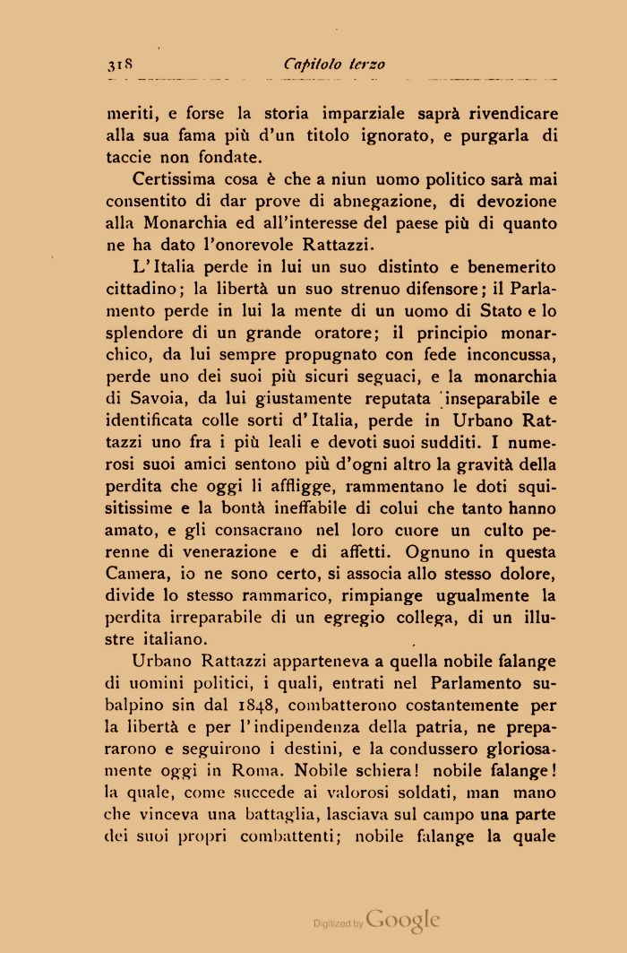 Urbano Rattazzi apparteneva a quella nobile falange di uomini politici, i quali, entrati nel Parlamento subalpino sin dal 1848, combatterono costantemente per la libertà e per l'indipendenza della patria, ne prepararono e seguirono i destini, e la condussero gloriosamente oggi in Roma. Nobile schiera! nobile falange! la quale, come succede ai valorosi soldati, man mano che vinceva una battaglia, lasciava sul campo una parte dei suoi propri combattenti; nobile falange la quale