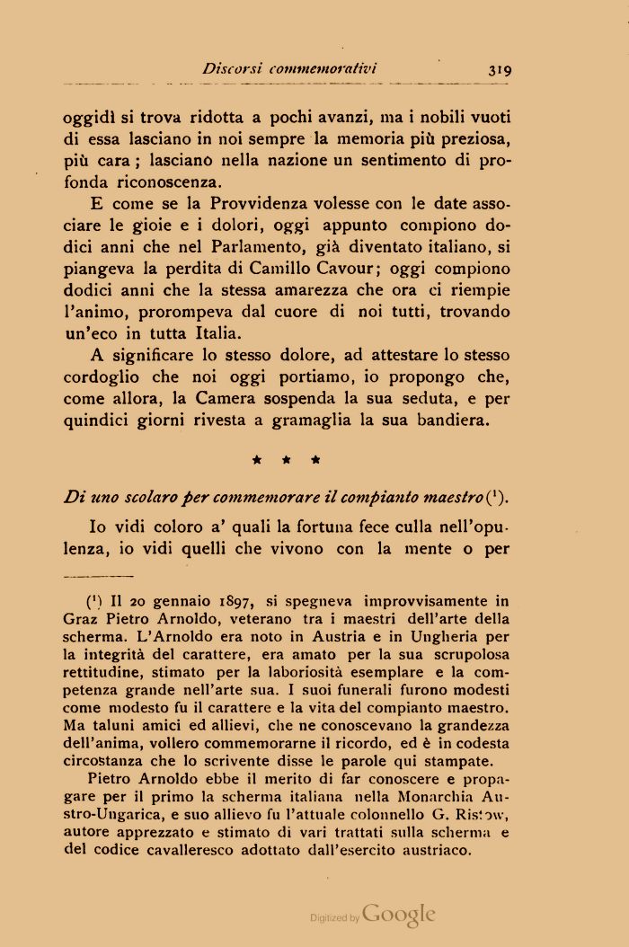 (') Il 20 gennaio 1S97, si spegneva improvvisamente in Graz Pietro Arnoldo, veterano tra i maestri dell'arte della scherma. L'Arnoldo era noto in Austria e in Ungheria per la integrità del carattere, era amato per la sua scrupolosa rettitudine, stimato per la laboriosità esemplare e la competenza grande nell'arte sua. I suoi funerali furono modesti come modesto fu il carattere e la vita del compianto maestro. Ma taluni amici ed allievi, che ne conoscevano la grandezza dell'anima, vollero commemorarne il ricordo, ed è in codesta circostanza che lo scrivente disse le parole qui stampate.
