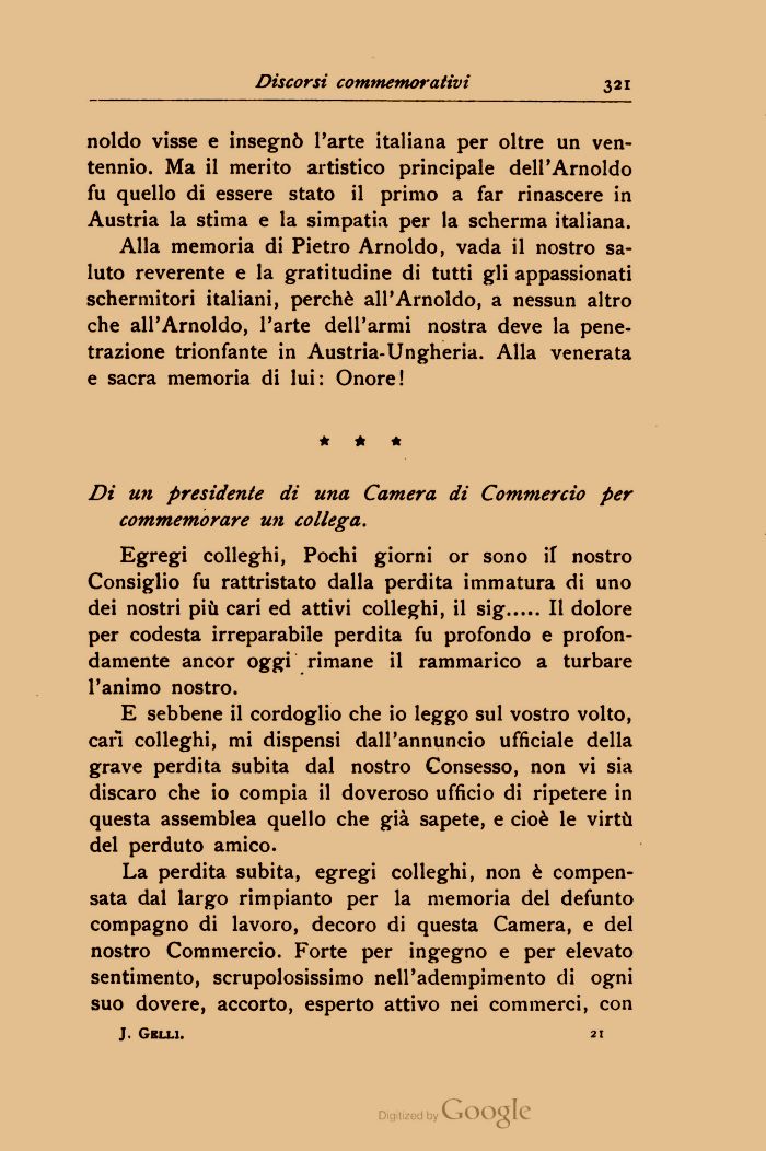 La perdita subita, egregi colleghi, non è compensata dal largo rimpianto per la memoria del defunto compagno di lavoro, decoro di questa Camera, e del nostro Commercio. Forte per ingegno e per elevato sentimento, scrupolosissimo nell'adempimento di ogni suo dovere, accorto, esperto attivo nei commerci, con