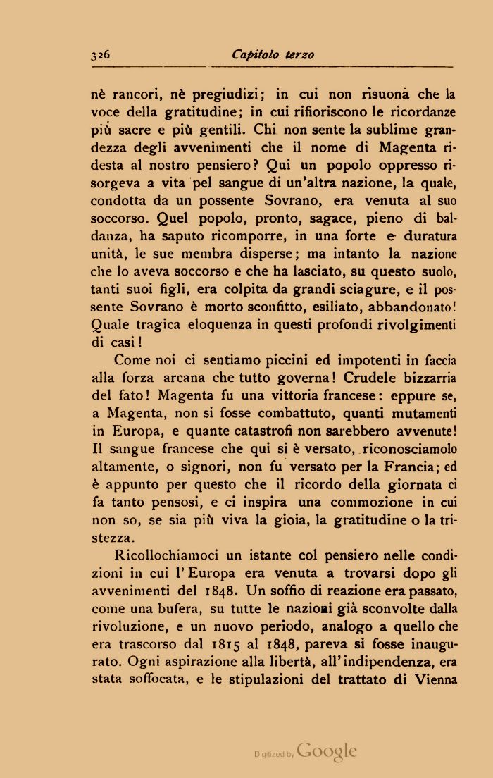 Come noi ci sentiamo piccini ed impotenti in faccia alla forza arcana che tutto governa ! Crudele bizzarria del fato! Magenta fu una vittoria francese : eppure se, a Magenta, non si fosse combattuto, quanti mutamenti in Europa, e quante catastrofi non sarebbero avvenute! Il sangue francese che qui si è versato, riconosciamolo altamente, o signori, non fu versato per la Francia; ed è appunto per questo che il ricordo della giornata ci fa tanto pensosi, e ci inspira una commozione in cui non so, se sia più viva la gioia, la gratitudine o la tristezza.