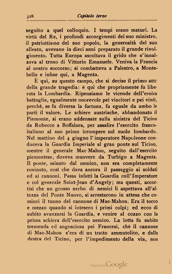 seguito a quel colloquio. I tempi erano maturi. La virtų del Re, i profondi accorgimenti del suo ministro, il patriottismo del suo popolo, la generositā del suo alleato, avevano in dieci anni preparato il grande rivolgimento. Tutta Europa ascoltava il grido che s'innalzava al trono di Vittorio Emanuele. Veniva la Francia al nostro soccorso ; si combatteva a Palestro, a Monte-bello e infine qui, a Magenta.