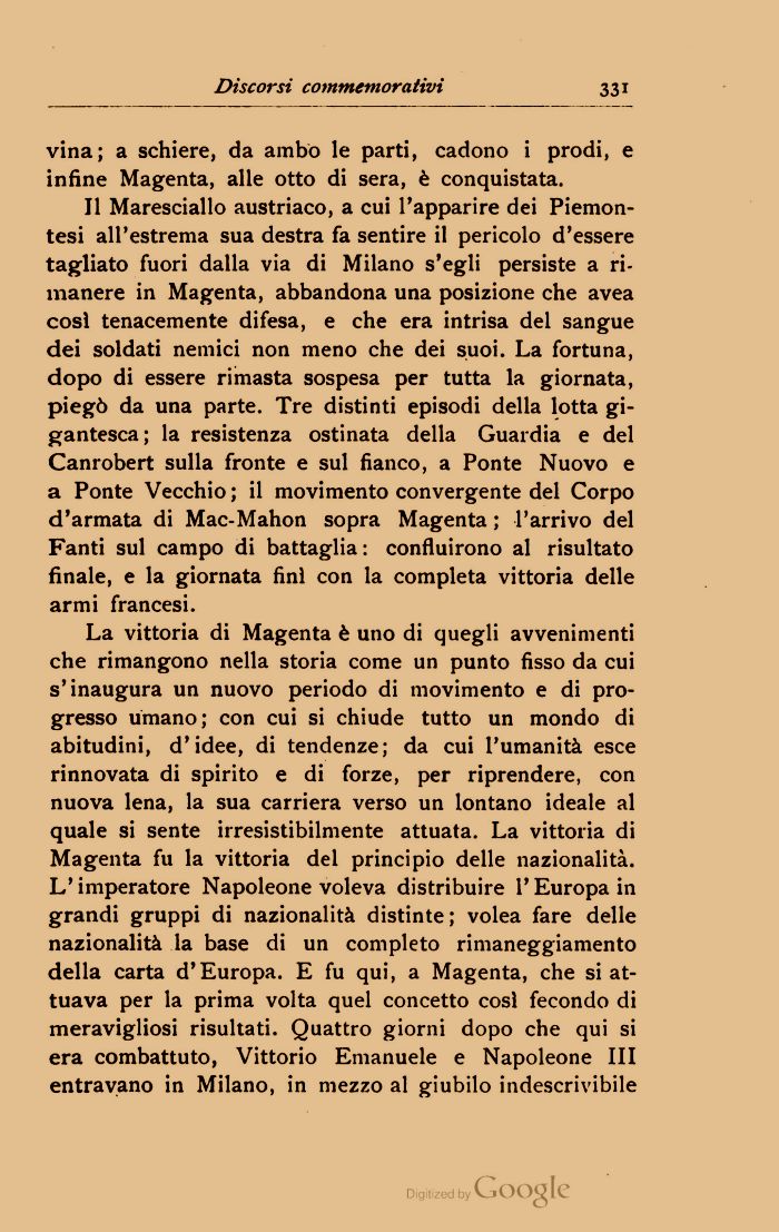 La vittoria di Magenta è uno di quegli avvenimenti che rimangono nella storia come un punto fisso da cui s'inaugura un nuovo periodo di movimento e di progresso umano; con cui si chiude tutto un mondo di abitudini, d'idee, di tendenze; da cui l'umanità esce rinnovata di spirito e di forze, per riprendere, con nuova lena, la sua carriera verso un lontano ideale al quale si sente irresistibilmente attuata. La vittoria di Magenta fu la vittoria del principio delle nazionalità. L'imperatore Napoleone voleva distribuire l'Europa in grandi gruppi di nazionalità distinte; volea fare delle nazionalità la base di un completo rimaneggiamento della carta d'Europa. E fu qui, a Magenta, che si attuava per la prima volta quel concetto così fecondo di meravigliosi risultati. Quattro giorni dopo che qui si era combattuto, Vittorio Emanuele e Napoleone III entravano in Milano, in mezzo al giubilo indescrivibile