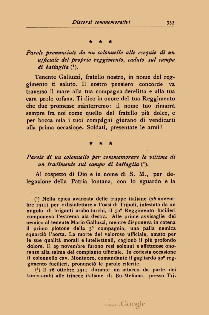 (') Nella epica avanzata delle truppe italiane (26 novembre 1911) per «disinfettare» l'oasi di Tripoli, infestata da un nugolo di briganti arabo turchi, il 50 Reggimento fucilieri componeva l'estrema ala destra. Alle prime avvisaglie del nemico al tenente Mario Galluzzi, mentre disponeva in catena il primo plotone della 5a compagnia, una palla nemica squarciò l'aorta. La morte del valoroso ufficiale, amato per le sue qualità morali e intellettuali, cagionò il più profondo dolore. Il 29 novembre furono resi solenni e affettuose onoranze alla salma del compianto ufficiale. In codesta occasione il colonnello cav. Montuoro, comandante il gagliardo 50 reggimento fucilieri, pronunciò le parole riferite.
