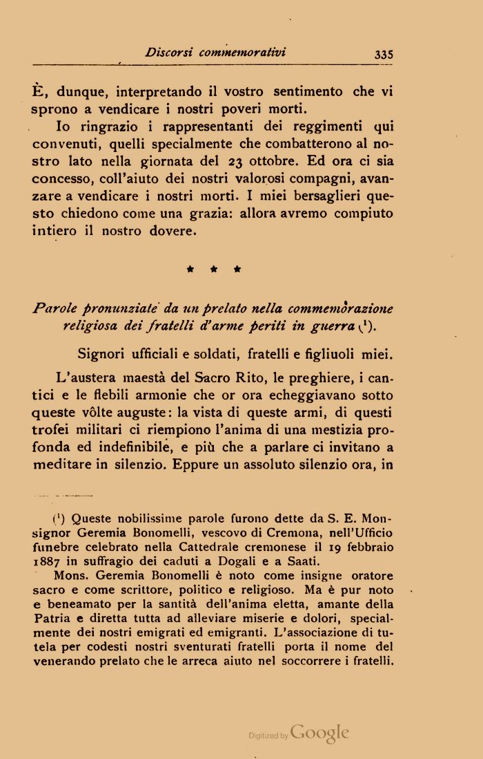 (') Queste nobilissime parole furono dette da S. E. Monsignor Geremia Bonomelli, vescovo di Cremona, nell'Ufficio funebre celebrato nella Cattedrale cremonese il 19 febbraio 1887 in suffragio dei caduti a Dogali e a Saati.